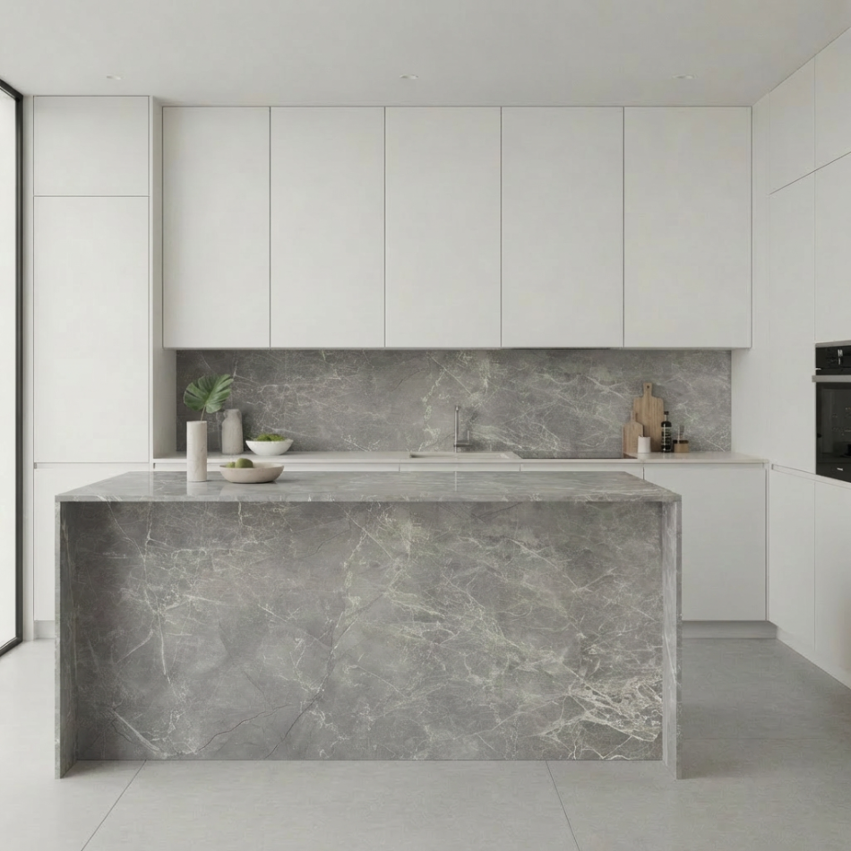 Vinilo resistente para encimera de cocina, muebles y paredes, con acabado efecto mármol gris, diseñado para transformar superficies de forma rápida y económica.